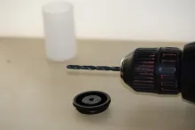 Arm a drill with a 3mm or 1/10" drill bit. Take off the lid and drill a hole in the center of it and clean it up a bit.