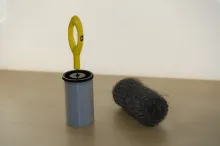 A film canister is perfect, but in these digital times they can be hard to find. A local photo shop may have them laying around in the waste, and then you can usually pick them up for free. As a replacement, you can use a similar small lidded, cylindrical container. A cleaned up pill glass will do.