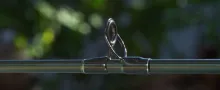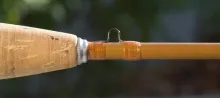 This rod is quite different from most carbon rods. The rod has been enamelled with a light tan color and stripes to mimic bamboo. At the same time it is finished like a traditional bamboo rod with a small agate-style stripping guide, snakes and a smallish tip top. The wraps are clear with a very nice and well controlled layer of varnish. You can, in other words, see the feet of the guides through the varnish and wrappings.