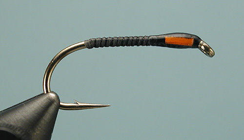- Tie in the black kevlar at the head, work back down the body tying in the kevlar to where the bend of the hook just starts.