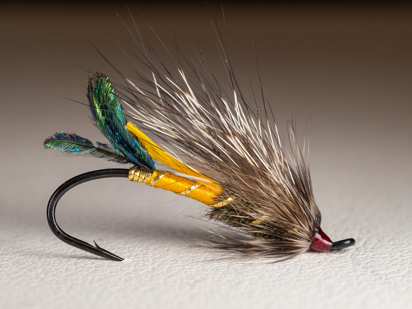 | Body | Rear half, orange-yellow floss, veiled by same, front half Peacock Herl |