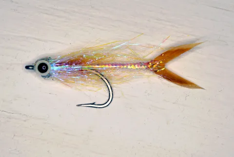 | Tail | Two Whiting Hen Saddle feathers, ginger. 1½ inch (3 centimeters) of small Mylar tubing, color Pearl. Deer Creek Diamond Fine Flex to reinforce. |