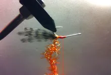 6. Tie in midway between the chenille and the hook eye, pointing towards the rear of the fly