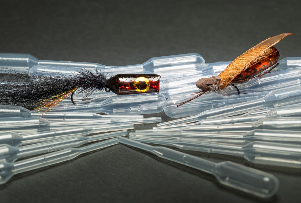 To form the popper body first push in the domed end of the pipette bulb with the end of a pencil to create a cavity to displace water as the fly is pulled. Then melt the stem and pinch it at the back of the bulb while the plastic is warm to make a flat section for tying in that will prevent the body from twisting on the hook. Finish off the body by colouring, sticking on eyes and giving it a coat of varnish or UV-resin to seal the eyes.