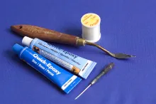 I usually tie several at one sitting, that's the easy part. Then I will take a break and return later to set up the epoxying. Mixing only small amounts at a time is made a little easier if you use a painter's knife as shown in the picture. Remember, epoxy is extremely allergy causing, so don't get it on you - anywhere!