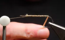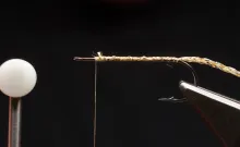 The body can, as already mentioned, be tied in gold or a suitable color like cream or orange. The original prescribed oval gold tinsel wrapped for the body, but I have used a braided gold yarn, which is easier to handle – and much less expensive.