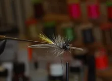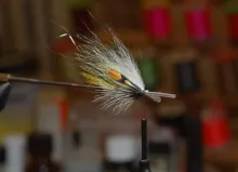 The Dirty White uses discrete and light colors combined with a natural light gray mallard front hackle to obtain a subdued but still nice appearance. The combination of yellow, white and light gray makes it a fine fly for bright conditions in clear water.