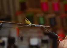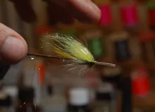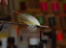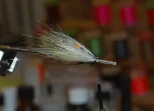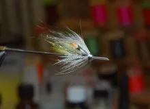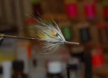 We continue our series of tube flies tied in the Scandinavian style. This fly is another subdued yellow, white and gray fly, well suited for bright light and clear water. It uses a mallard hackle to create a nice, closed shape.