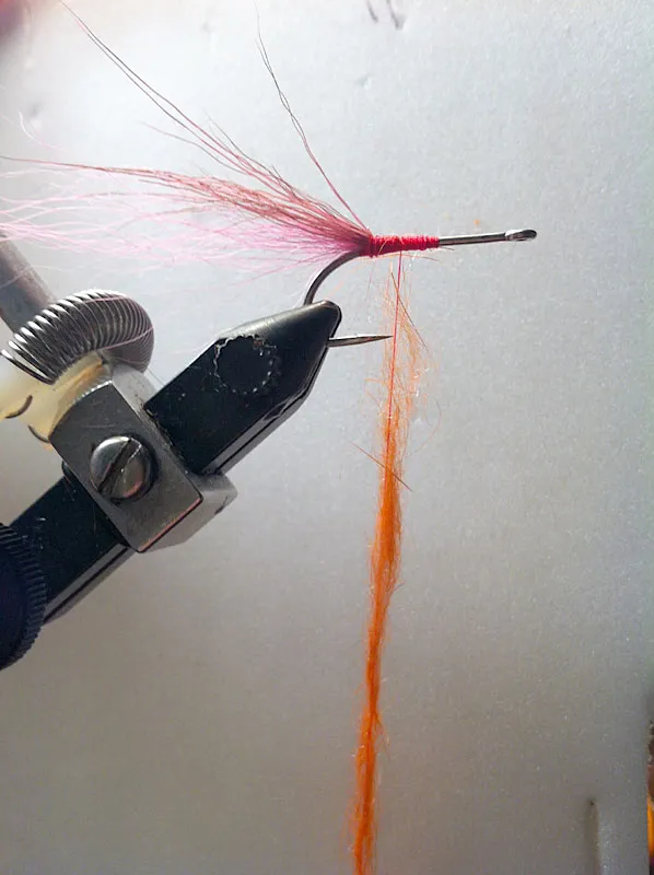 Tie in an even smaller bunch of brown bucktail, Dub the thread and make a small bump to support the antennae and eyes