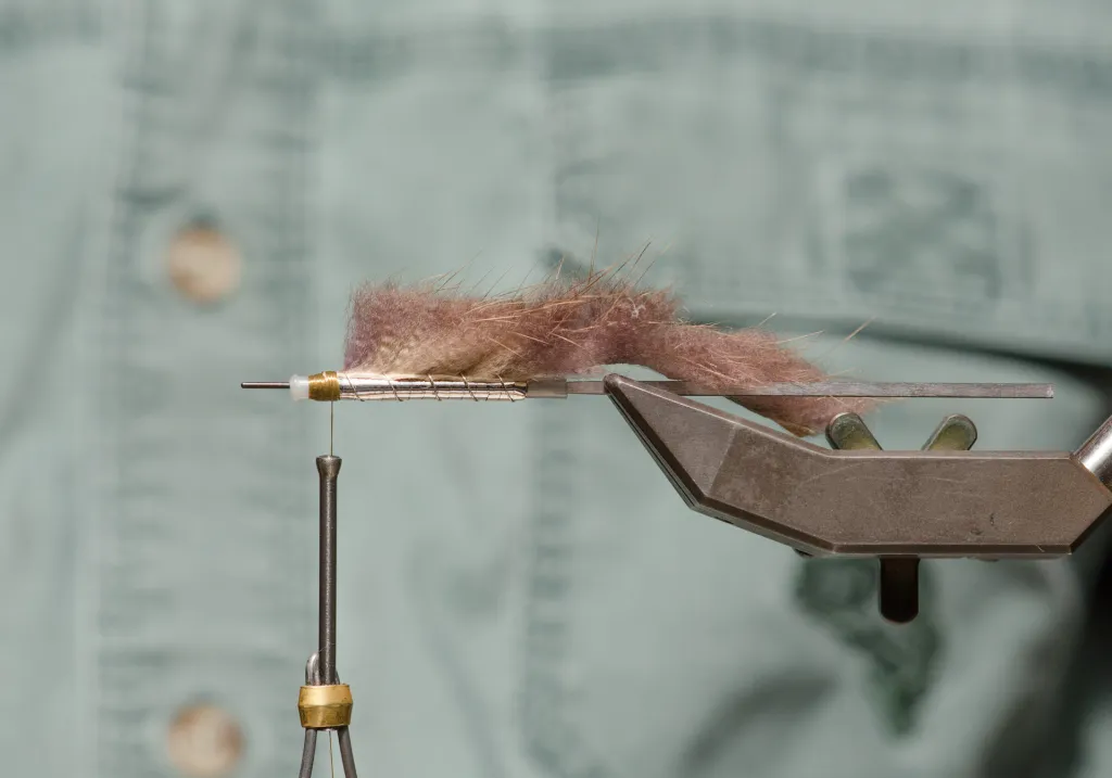 Cut off the remaining tinsel and take the thread back to the front of the fur