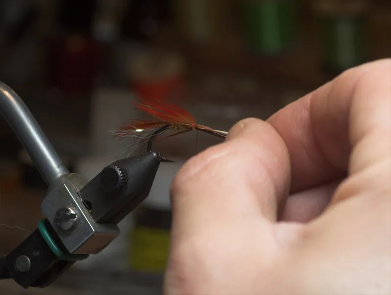 Strip the fluffy part off a Glolden Pheasant body feather and take a loose turn of thread around the stem and the base of the first barbs