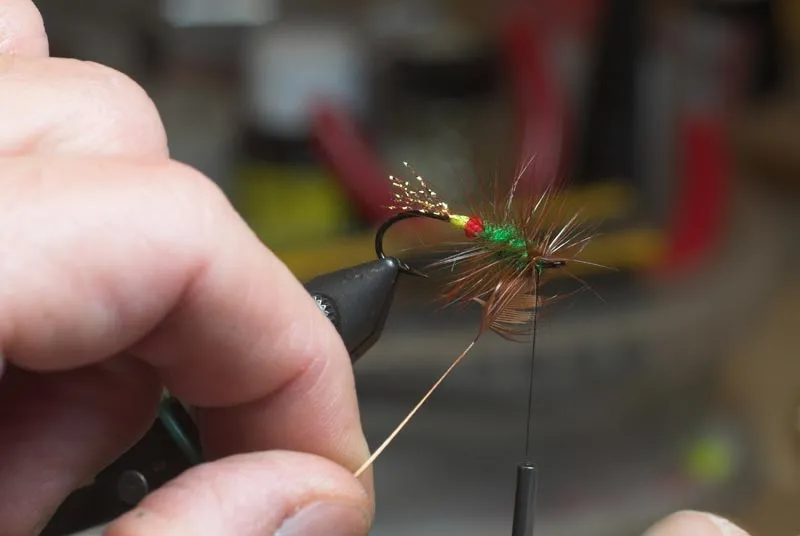 Hackle over the dubbed body, pulling the feather fairly tight. Finish as the deer hair version.