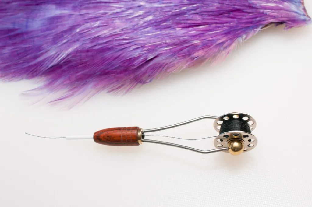 Some tyers re-spool their thread to sewing machine spools, which work fine in this compact ceramic Wasatch bobbin holder