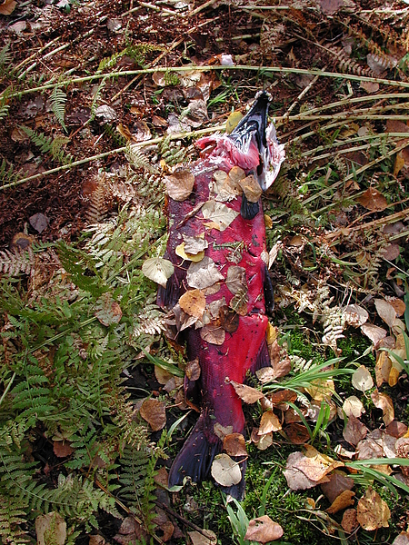 End of the run- After 100 miles of travel to it's spawning stream this buck Coho met it's end in the jaws of a Brown Bear. Note the claw marks and head. No doubt he was able to spread his seed first.