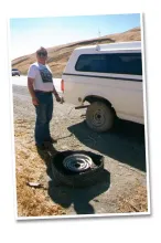 The trip would turn out to be an experience in itself. On our way north out of Santa Cruz, we had to cross the Altamont Pass. The highway crossing this pass is - as all that's American - large. It has many lanes, and we were calmly cruising along when a bang suddenly sent the car swaying and Rich had to find the roadside in a hurry. We had blown a rear tire, and had to do a roadside change.