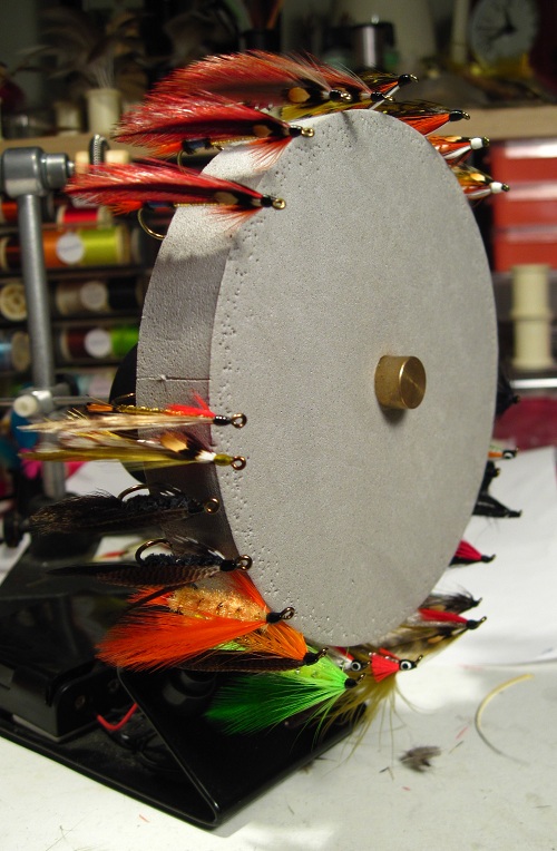 Drying wheelOne of the better investments I've made in recent years is this drying wheel from Cabelas. Since I tie a lot of streamers and use a rather viscous cement for the heads, I need a way to spin the fly as they dry to avoid drips and sags. You can either rotate your vise and whistle dixie, or stick it on a drying wheel. This wheel is always to my left on the desk and usually covered in flies like it is here. |