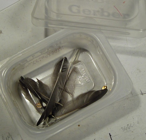 Snap lid plastic boxesWhen my kids were young, baby food came in jars (which were handy in their own right). Now Gerber sells food in these little snap lid plastic boxes! When my nephew had his first son and I saw these things - my eyes lit up! Had to have a couple. I use one for storing loose exotic feathers that I don't want to throw away and want to keep track of. An extra jungle cock eye, a blue jay feather, maybe a golden pheasant crest. If I've plucked it but haven't used it, in here it goes. |