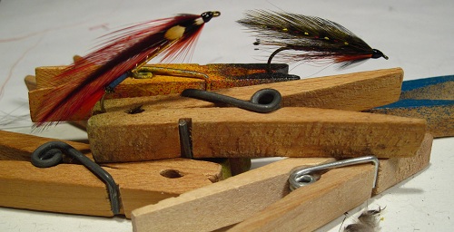 Clothes pinsClothes pins are another indispensable item on my desk. They hold flies as the head cement dries (wet flies and nymphs and such), they come in handy when you need a place to put a few stray strands of flash material, and they serve as an emergency aid if your thread breaks and you don't have a hackle pliers handy. You can probably steal a few from the house without anyone noticing. |