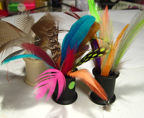 Save old thread spoolsEver need to tie a couple flies with a red hackle beard and feel guilty about tossing away the rest of the feather? Save your old thread spools and put those partially used feathers in the holes in the end. Next time you need a pinch of hackle, look there first before digging out your box of feathers. Danville spools are really good for this. |