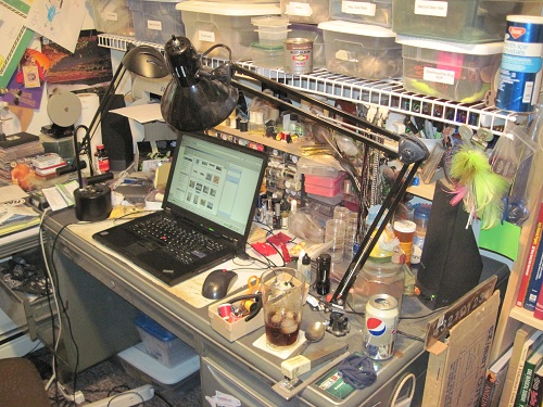 In the interest of sharing, I thought it might be fun to give you a little tour of my fly tying area and offer up a few thoughts along the way. Notice these are not pretty "smile and pose for the camera" type pictures that you often will see in magazines. This is a working fly tying desk, and I took the pictures after two days of tying featherwing streamers. The messes are real, which is what I believe would be most helpful to show. As Emeril would say "this is a cooking show."